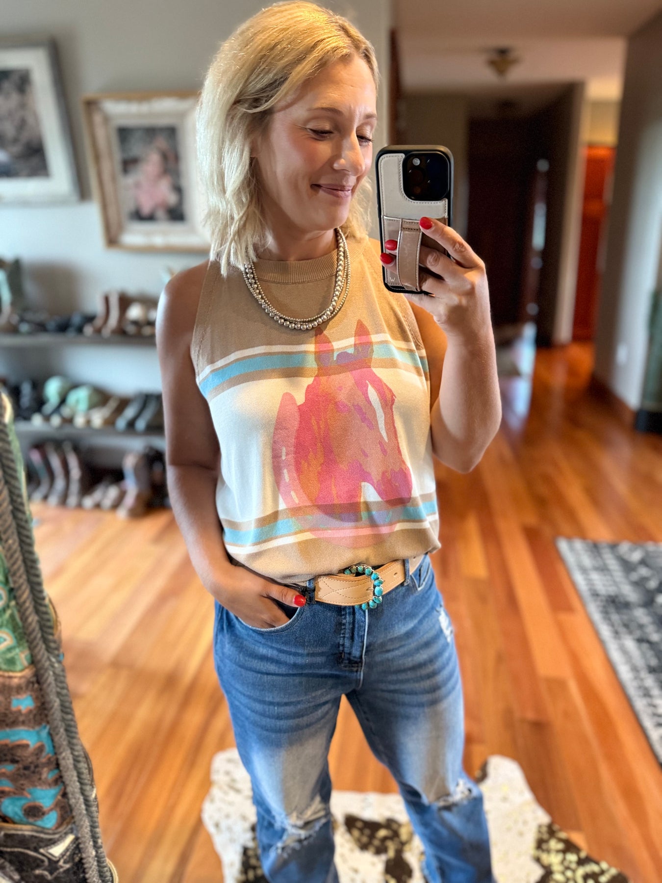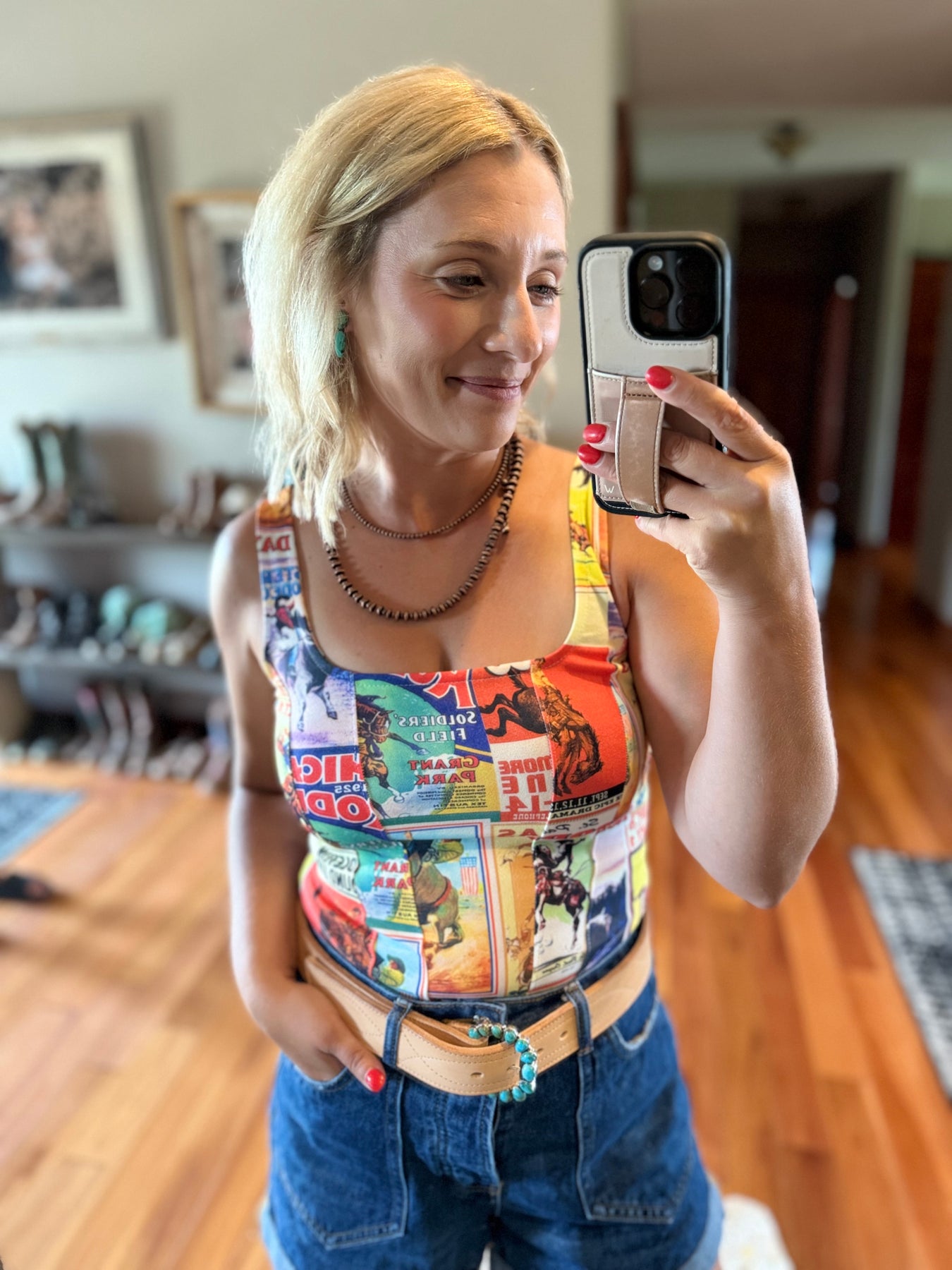 Woman taking a mirror selfie wearing a rodeo tank top and jeans showcasing a western leather belt and turquoise cluster belt buckle.