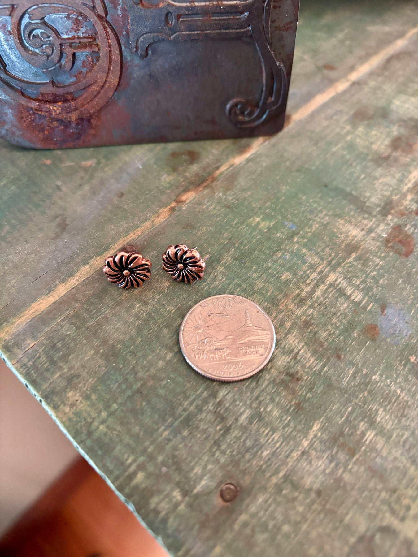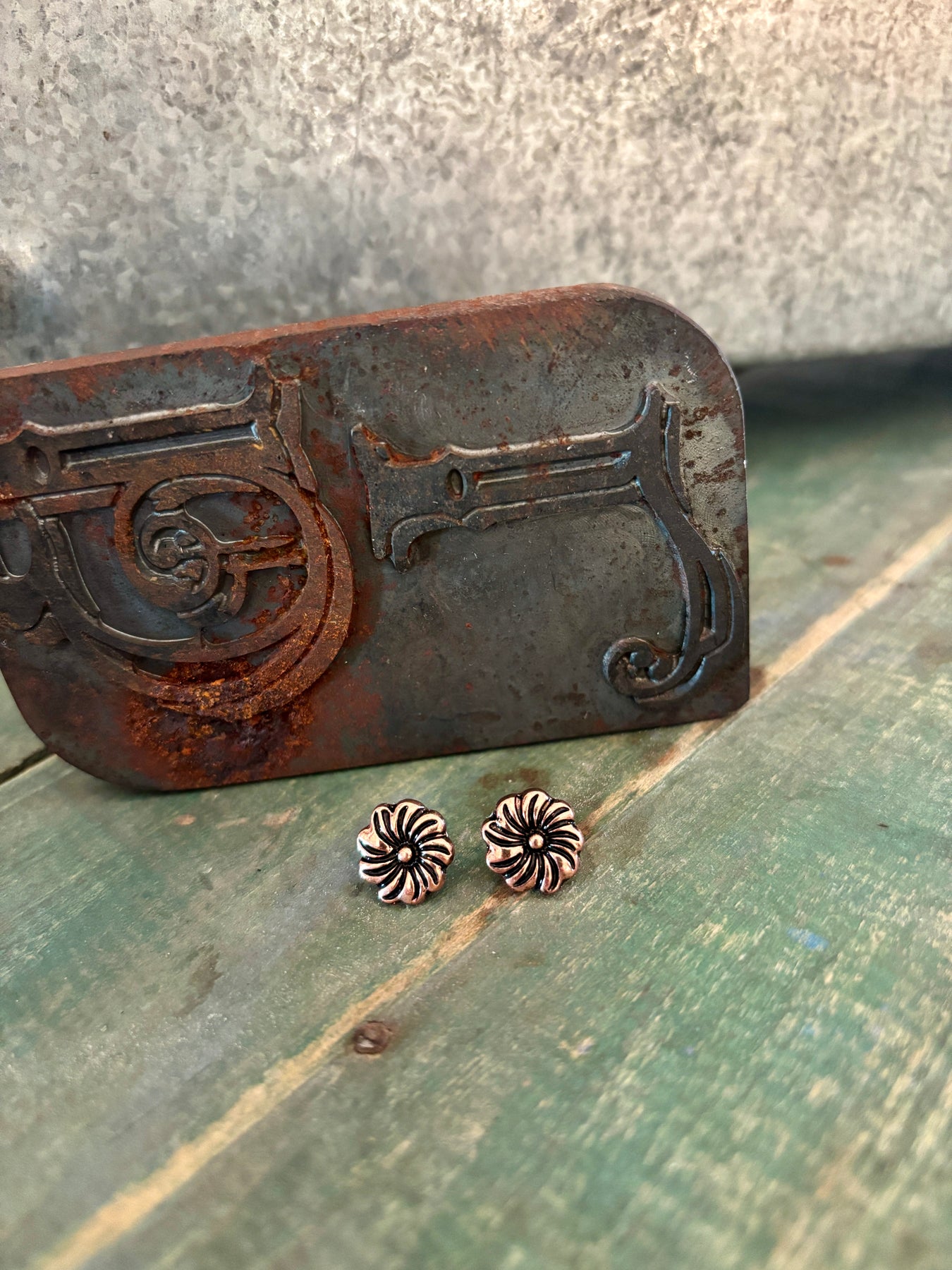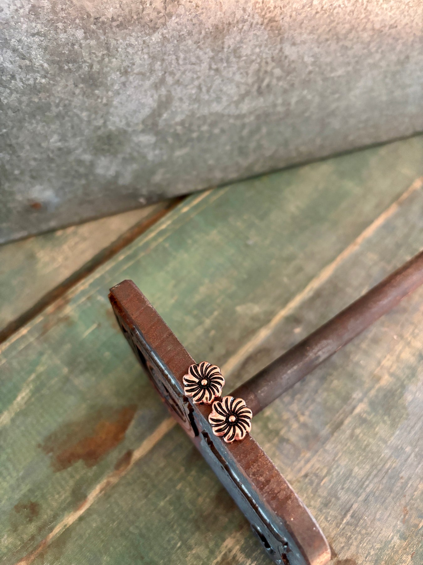 The Emery Copper Flower Stud Earrings are for the gals who don’t need big, flashy jewelry to make a point. These little beauties are engraved with a classic floral design, lightly oiled, and burnished to a bright shine that knows exactly when to behave and when to show off.
