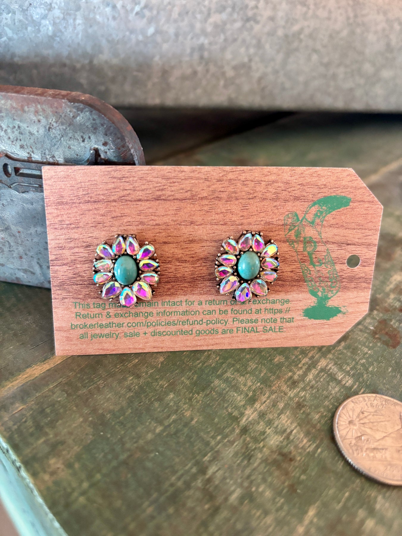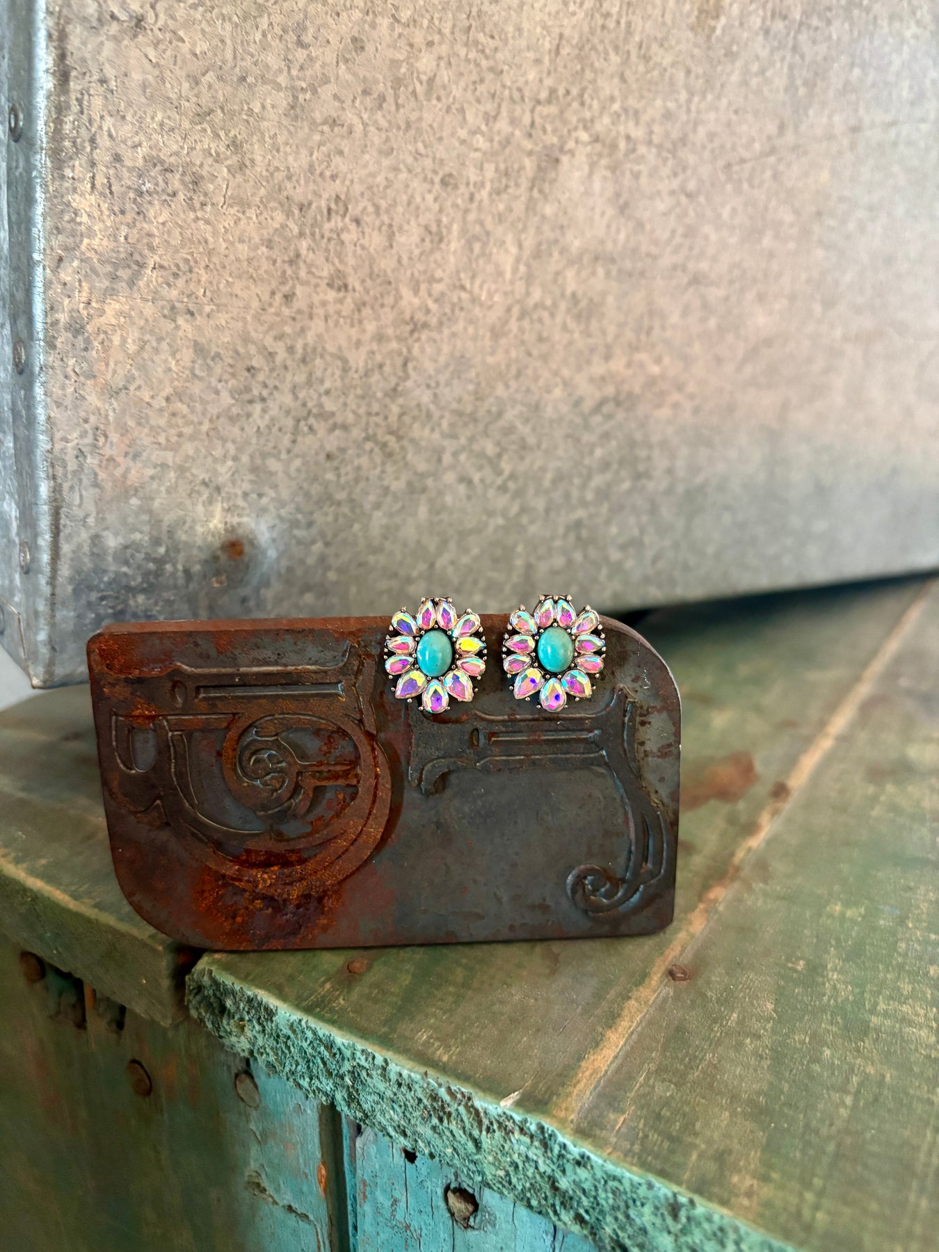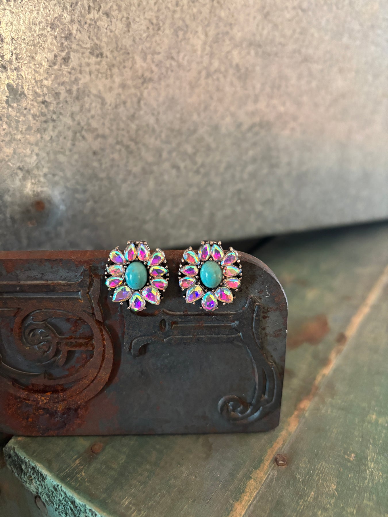 The Hayes Rhinestone Turquoise Cluster Earrings bring together a bold oval turquoise-look center stone and a halo of iridescent tear-shaped rhinestones that catch the light from every angle. One head turn and suddenly you’re the main character.