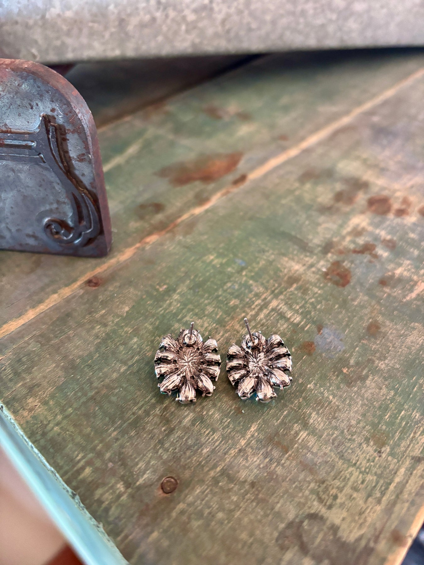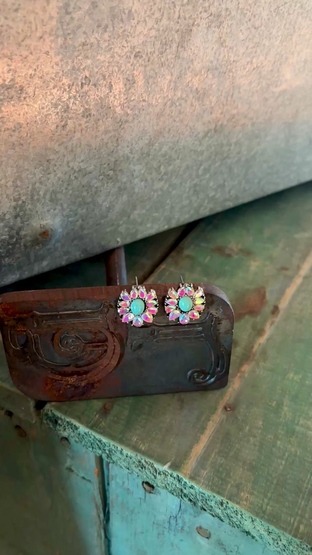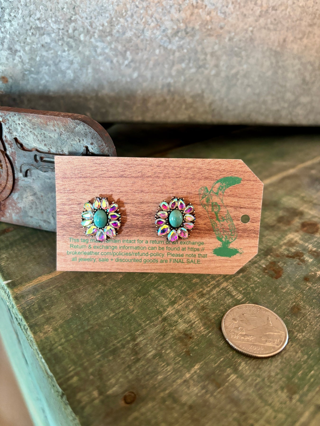 The Hayes Rhinestone Turquoise Cluster Earrings bring together a bold oval turquoise-look center stone and a halo of iridescent tear-shaped rhinestones that catch the light from every angle. One head turn and suddenly you’re the main character.